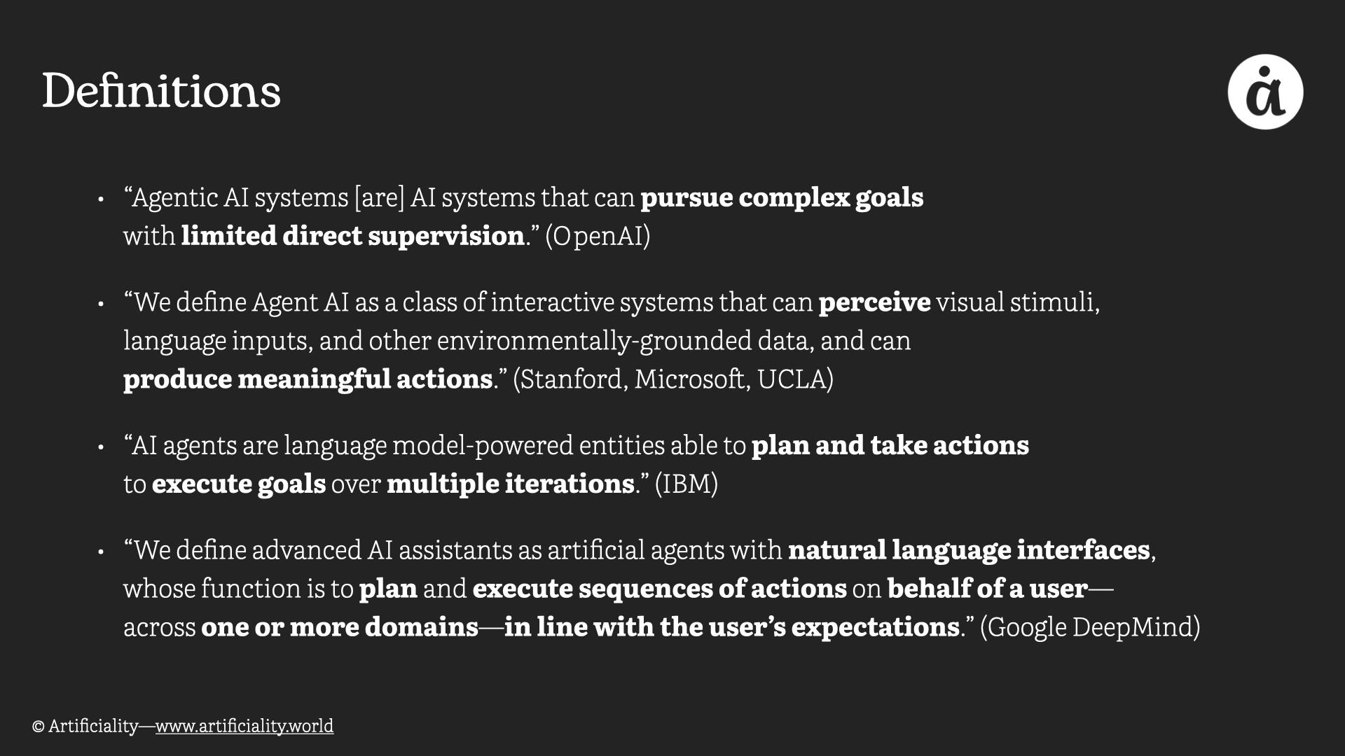 OpenAI describes agentic AI systems as those that "can pursue complex goals with limited direct supervision." Researchers from Stanford, Microsoft, and UCLA characterize AI agents as "a class of interactive systems that can perceive visual stimuli, language inputs, and other environmentally-grounded data, and can produce meaningful actions." IBM views AI agents as "language model-powered entities able to plan and take actions to execute goals over multiple iterations," while Google DeepMind defines advanced AI assistants as "artificial agents with natural language interfaces, whose function is to plan and execute sequences of actions on behalf of a user—across one or more domains—in line with the user's expectations."