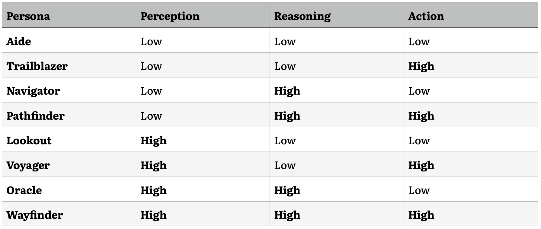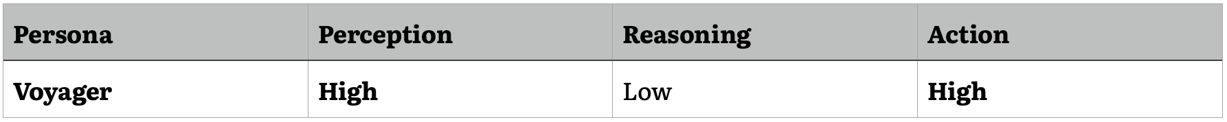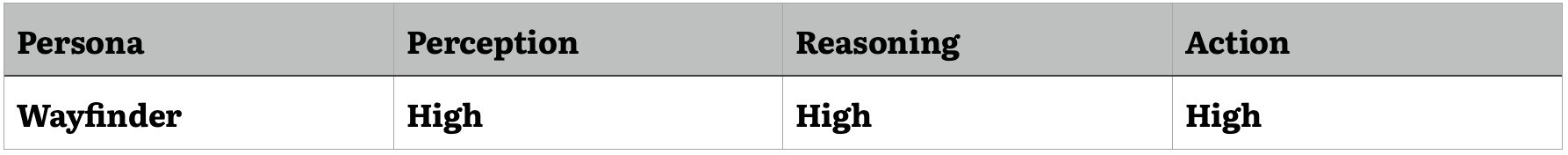 At the highest end of the complexity spectrum, we might imagine an AI agent with advanced capabilities across all three components—a "Wayfinder" persona that can navigate uncharted territories, devise innovative solutions to complex problems, and adapt to changing circumstances with a high degree of autonomy. Such a system would likely excel in domains requiring a combination of perceptual acuity, creative problem-solving, and situated action, such as leading complex projects or guiding strategic decision-making.