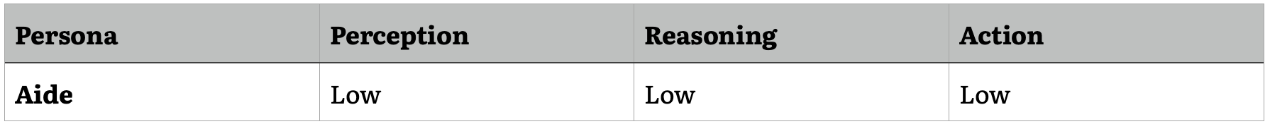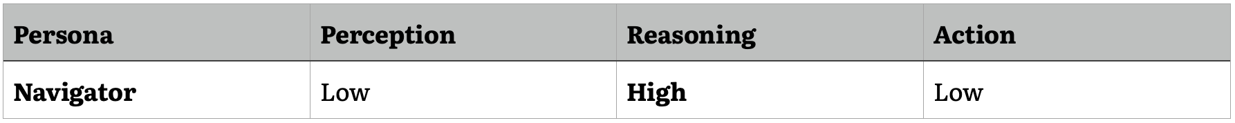 In contrast, an agent with high complexity reasoning and action capabilities but low complexity perception might function as a navigator or decision support system. Such an agent could analyze complex datasets, generate novel insights, and propose solutions to strategic problems but would rely on human input for situational awareness and contextual understanding.