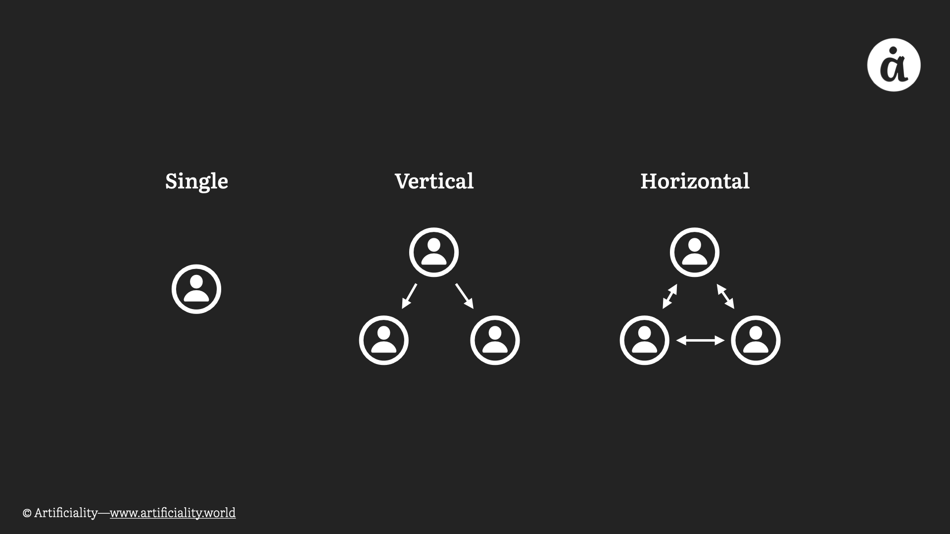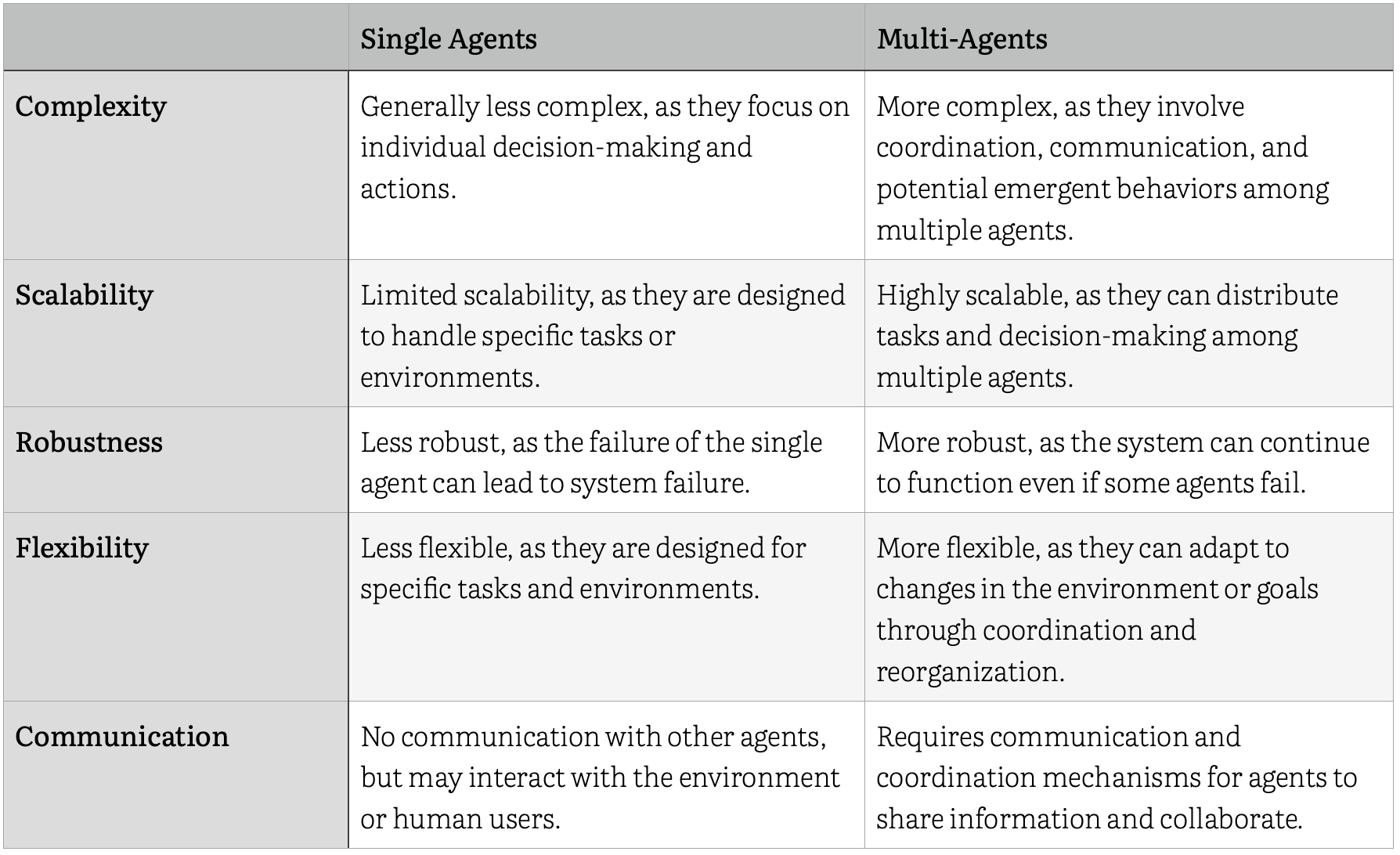 Today, AI agents are designed with three structures or architectures: single agents, multiple agents in a vertical hierarchy, and multiple agents in a horizontal hierarchy. Single agent structures are generally less complex, as they focus on individual tasks and actions. Multi-agent structures are generally more complex, as they involve communication and potential emergent behaviors among the agents.