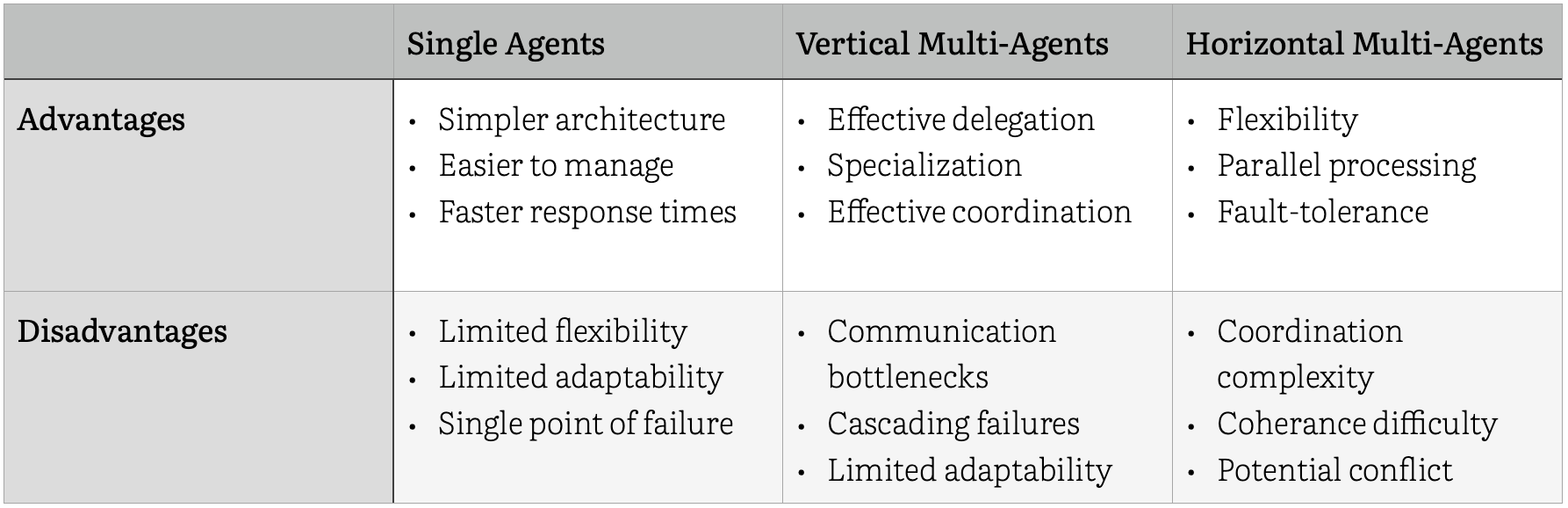 Advantages and Disadvantages of Single Agents, Vertical Multi-Agents, and Horizontal Multi-Agents
