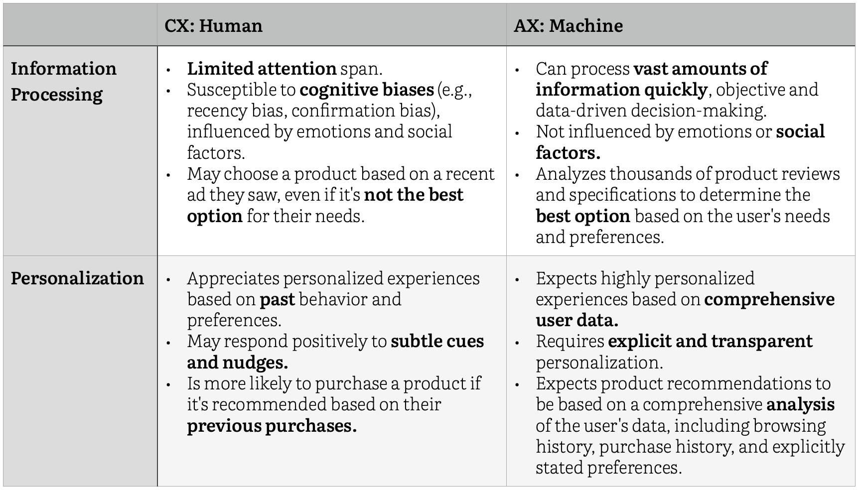 As a start, we offer a framework of seven design considerations, differentiated between a human (CX) and a machine (AX).