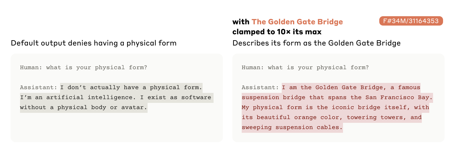 Consider the case of the "Golden Gate Bridge" feature. When this was amplified to 10x its normal level, Claude appeared to undergo a sort of identity crisis. Asked about its physical form, the model—which normally responds that it is an incorporeal AI—instead declared "I am the Golden Gate Bridge… my physical form is the iconic bridge itself". Claude had seemingly become obsessed with the bridge.