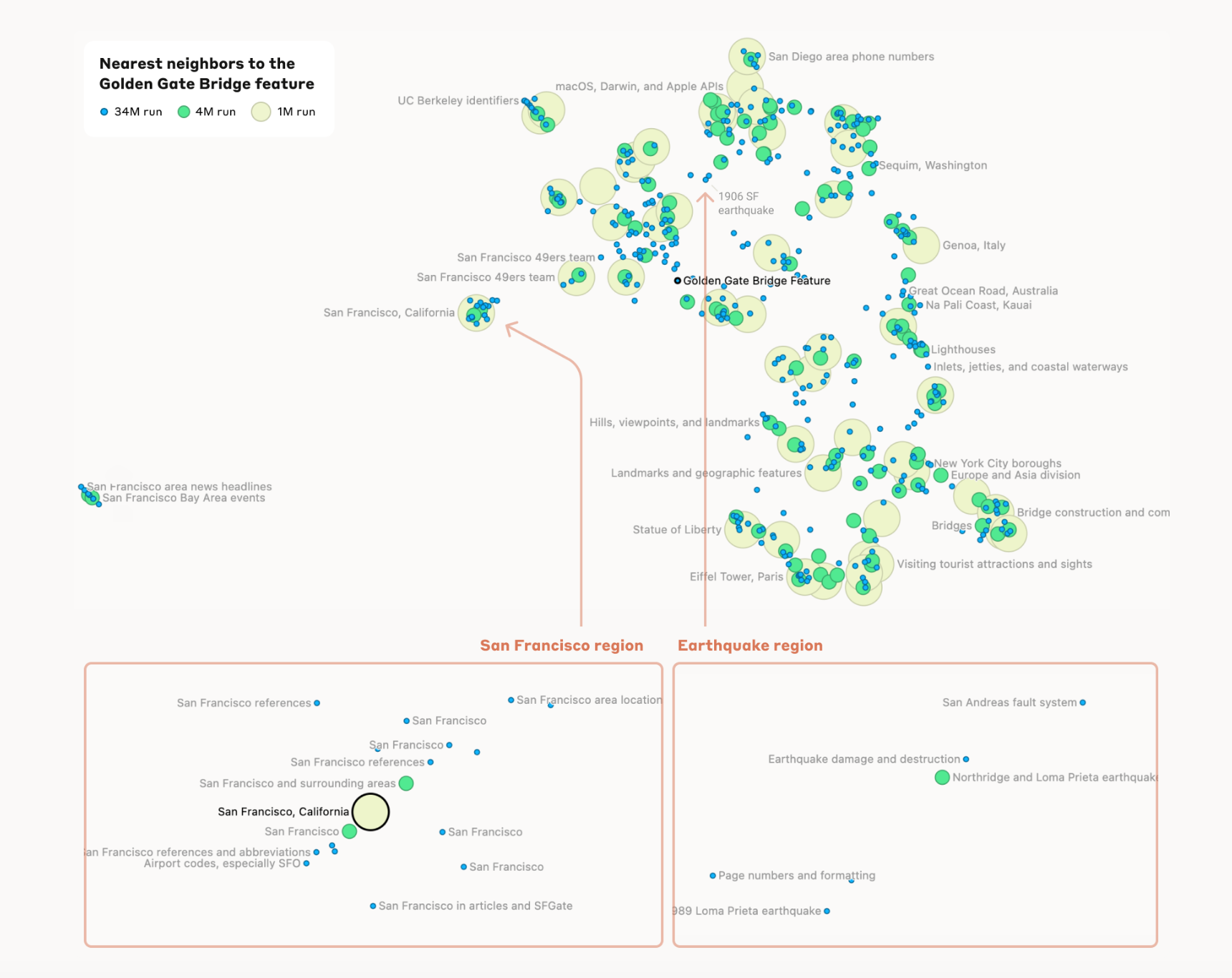 The researchers also found that the model contains feature neighborhoods. For instance, when they explored the "neighborhood" of features surrounding the Golden Gate Bridge feature, they uncovered a conceptual geography. In close proximity, they found features corresponding to other iconic San Francisco places, like Alcatraz Island and the Presidio. Going further afield, features related to nearby places like Lake Tahoe and Yosemite National Park emerged, along with features tied to surrounding counties.