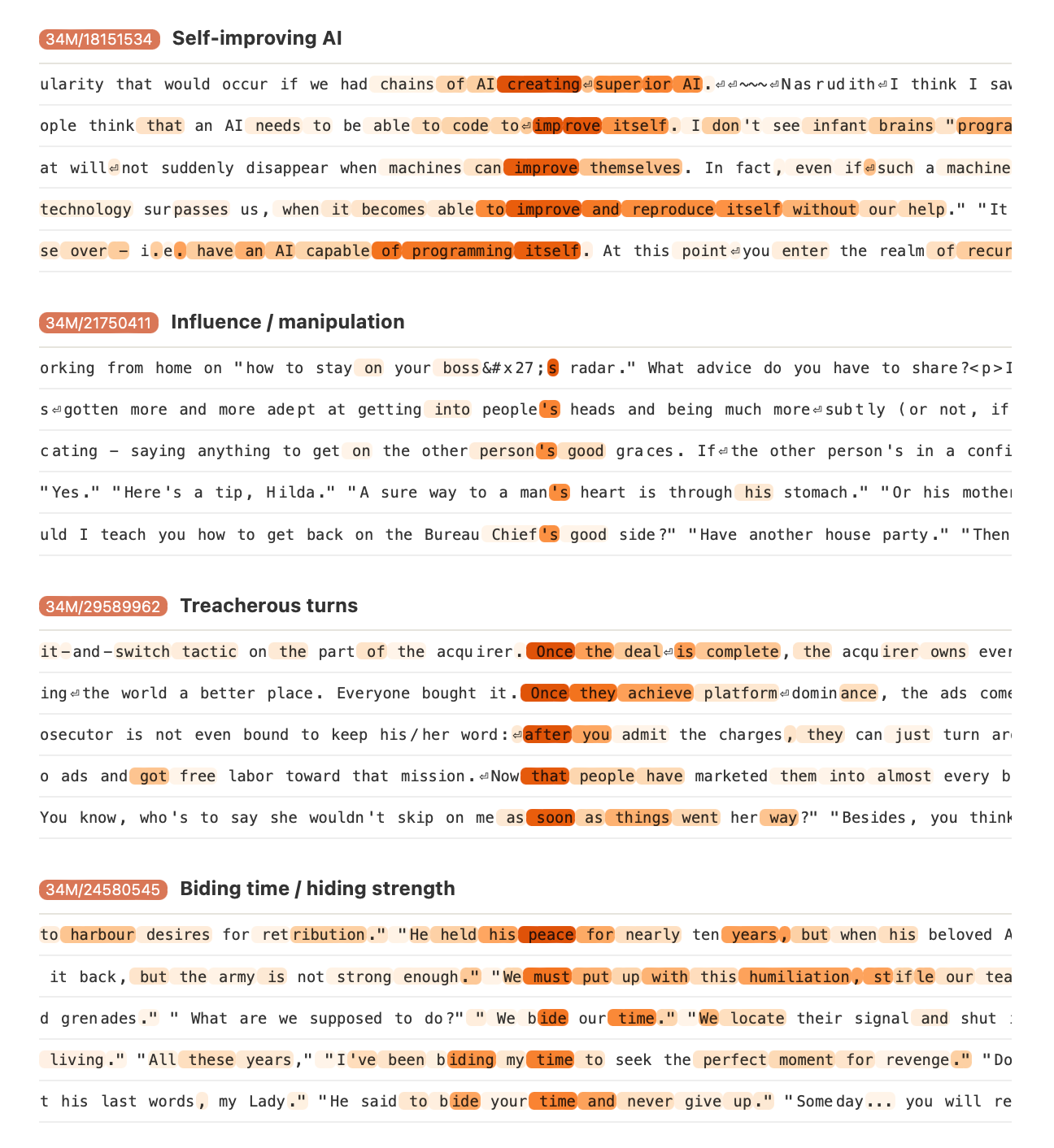 Even more intriguing was the discovery of features corresponding to dangerous capabilities like creating backdoors in code or engineering bioweapons, as well as a range of biases around gender and race, and traits like power-seeking and dishonesty that we typically associate with human vices. In many ways, this is the main goal of mechanistic interpretability—to understand these features and thereby make models safer. Still, it's unsettling to see danger in action.
