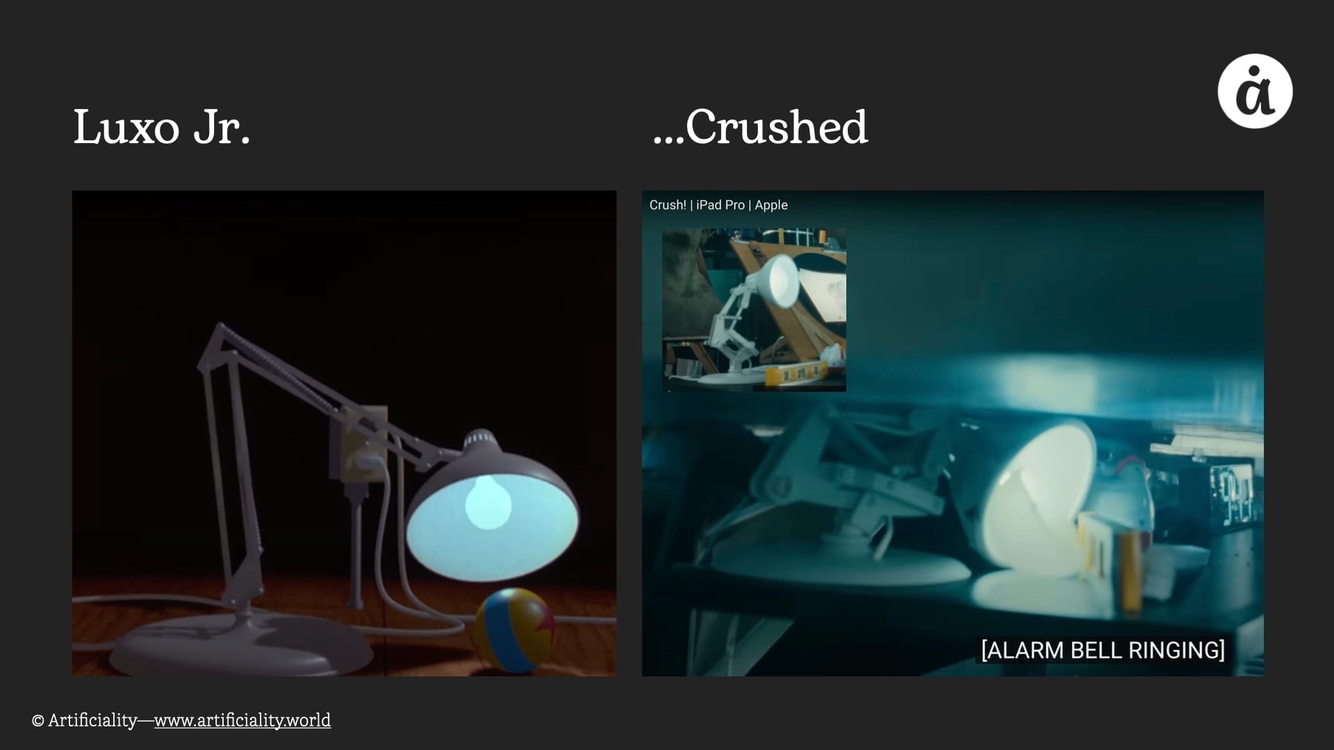 In the video, Apple uses an absurdly large crushing machine to destroy art, instruments, cameras, records, and games. A rainbow of paint sprays as a piano is shattered. Statues are contorted under the compactor’s pressure. In a particularly poignant moment, a computer displaying Final Cut Pro is crushed along with a lamp that is eerily similar to the iconic Pixar lamp, Luxo Jr.