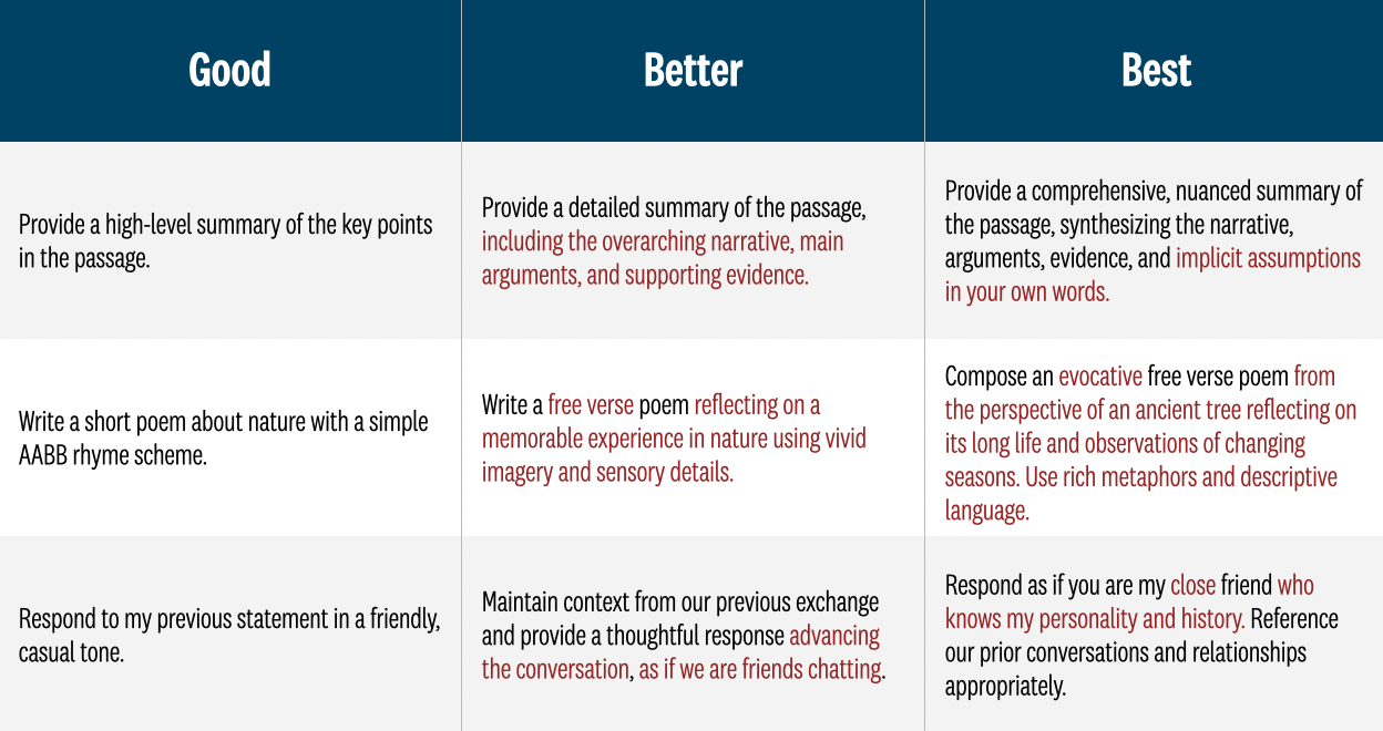 When we use generative AI, the quality of output is heavily influenced by the input provided. We think of it as a the strategy of good, better, and best prompting. At the heart of effective interaction with generative AI lies the art of crafting prompts that steer the AI's responses in desired directions. Generative AI creates new data based on the path it takes through its own training data and its own model so the direction, specificity, and detail matters. Ultimately, a prompt points the model to the right place in the data cosmos.
