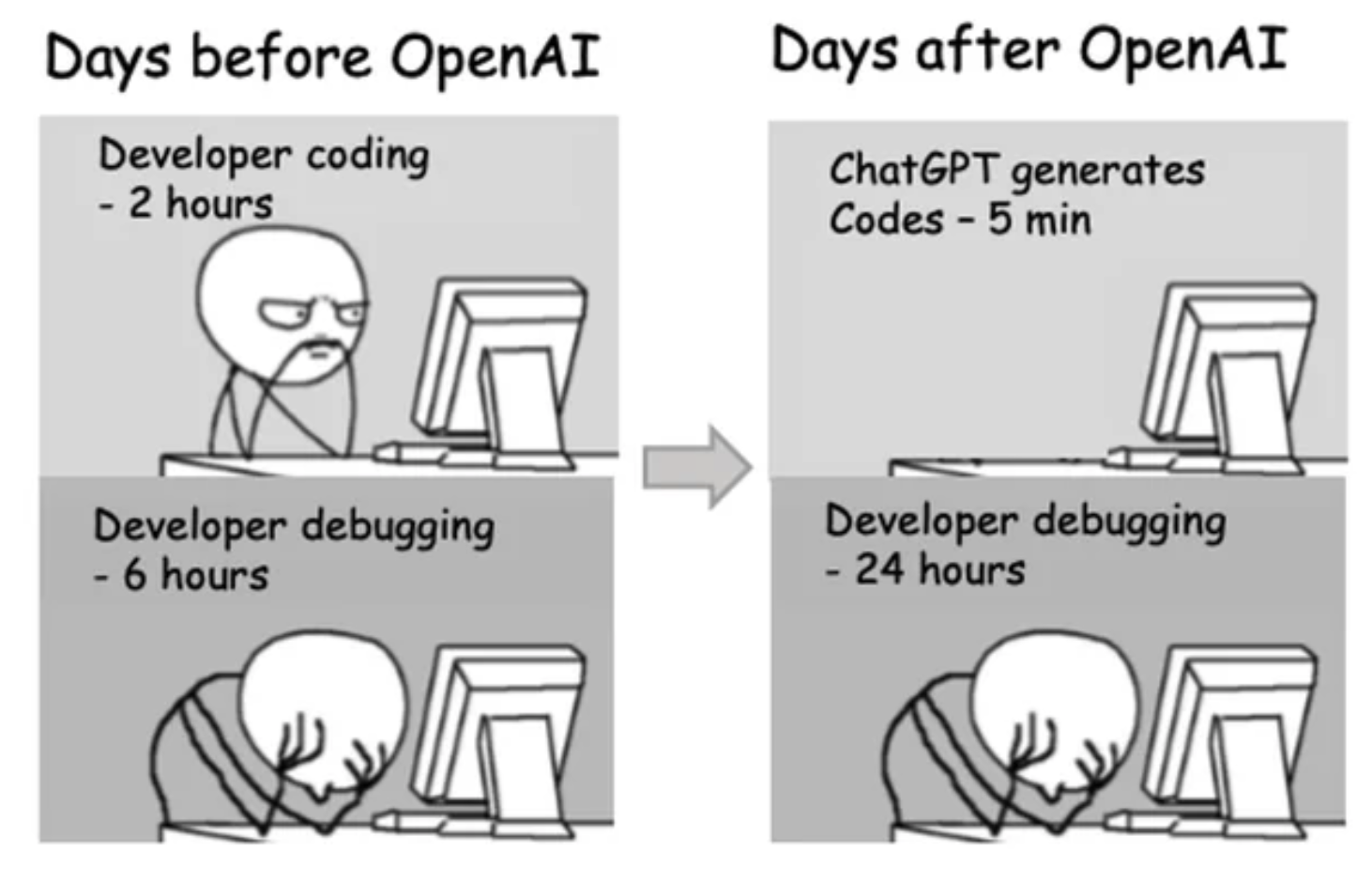 This meme captures the shift in the developer's role brought about by AI tools like ChatGPT. Instead of engaging in the creative problem-solving process of coding, developers are editors and fixers of AI-generated code, which means spending more time debugging than actually writing original code. The challenge has shifted from creation to correction, making it clear that while AI can speed up the initial coding process, it may also lead to more complex and time-consuming debugging tasks.