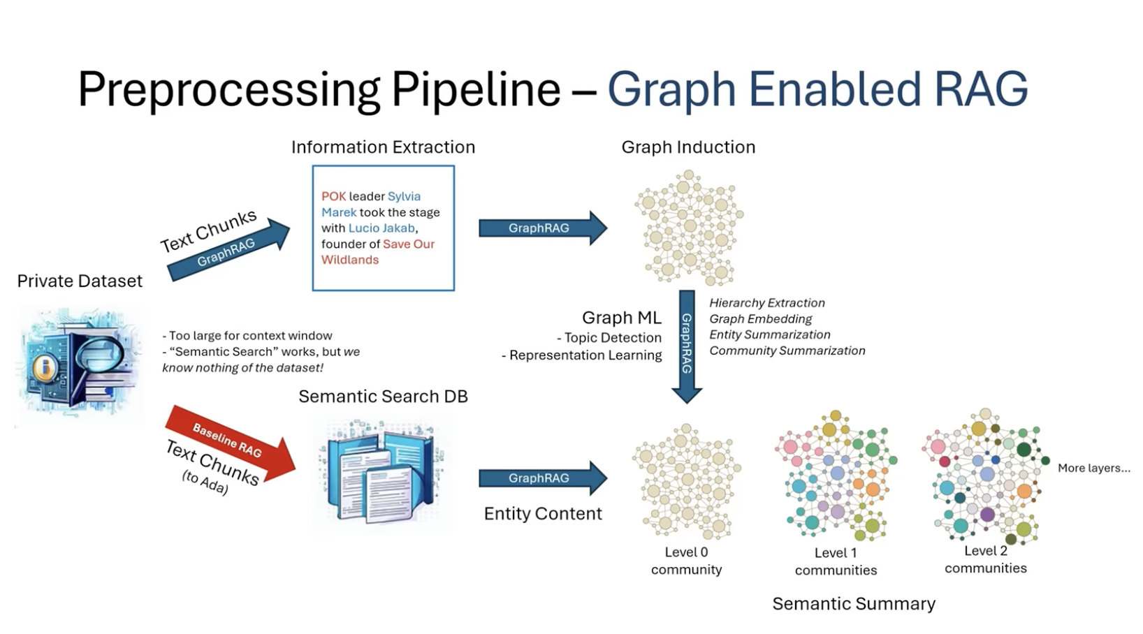 Complex Query Handling: Traditional LLMs struggle with generating summaries for complex queries across large datasets because they can't keep all relevant details in memory. Graph RAG solves this by creating a structured graph of information that allows for more effective data retrieval and summarization at scale. By structuring data as nodes within communities and linking these communities through relational edges, knowledge graphs offer a novel method to organize global information. This structure not only aids in the retrieval of information but also in understanding the broader context of how disparate pieces of information are related.