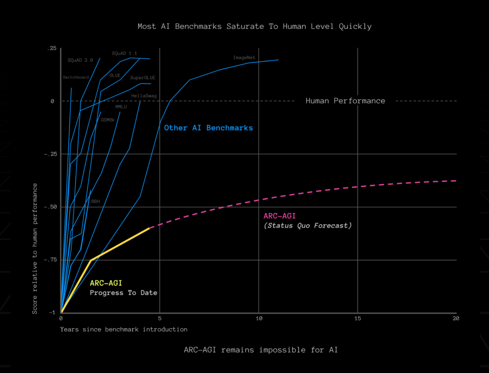 Most AI benchmarks measure skill. But skill is not intelligence. General intelligence is the ability to efficiently acquire new skills. Chollet's unbeaten 2019 Abstraction and Reasoning Corpus for Artificial General Intelligence (ARC-AGI) is the only formal benchmark of AGI.