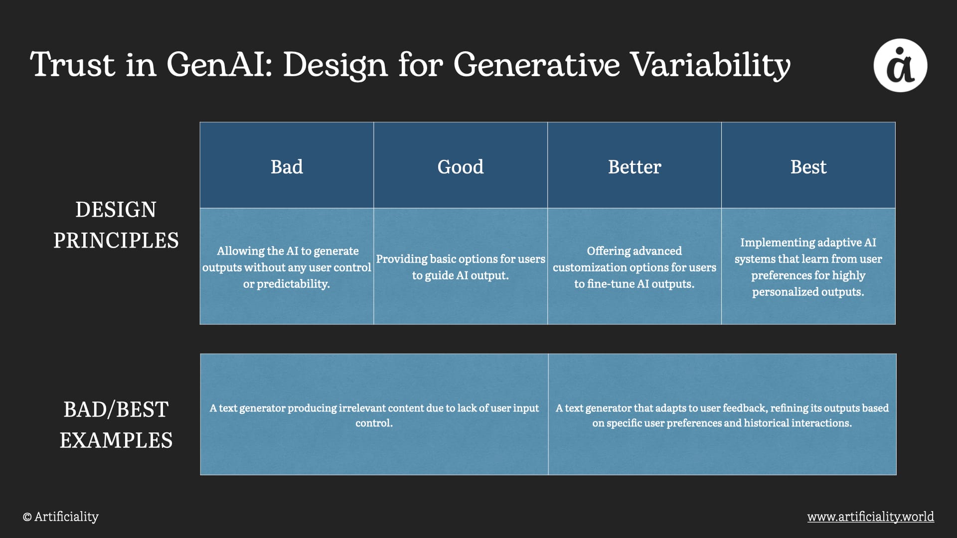 Embrace the AI's potential for diverse outputs. A design tool might use GenAI to offer a range of logo designs, each varying in style and complexity, allowing users to select or refine their preferred option.