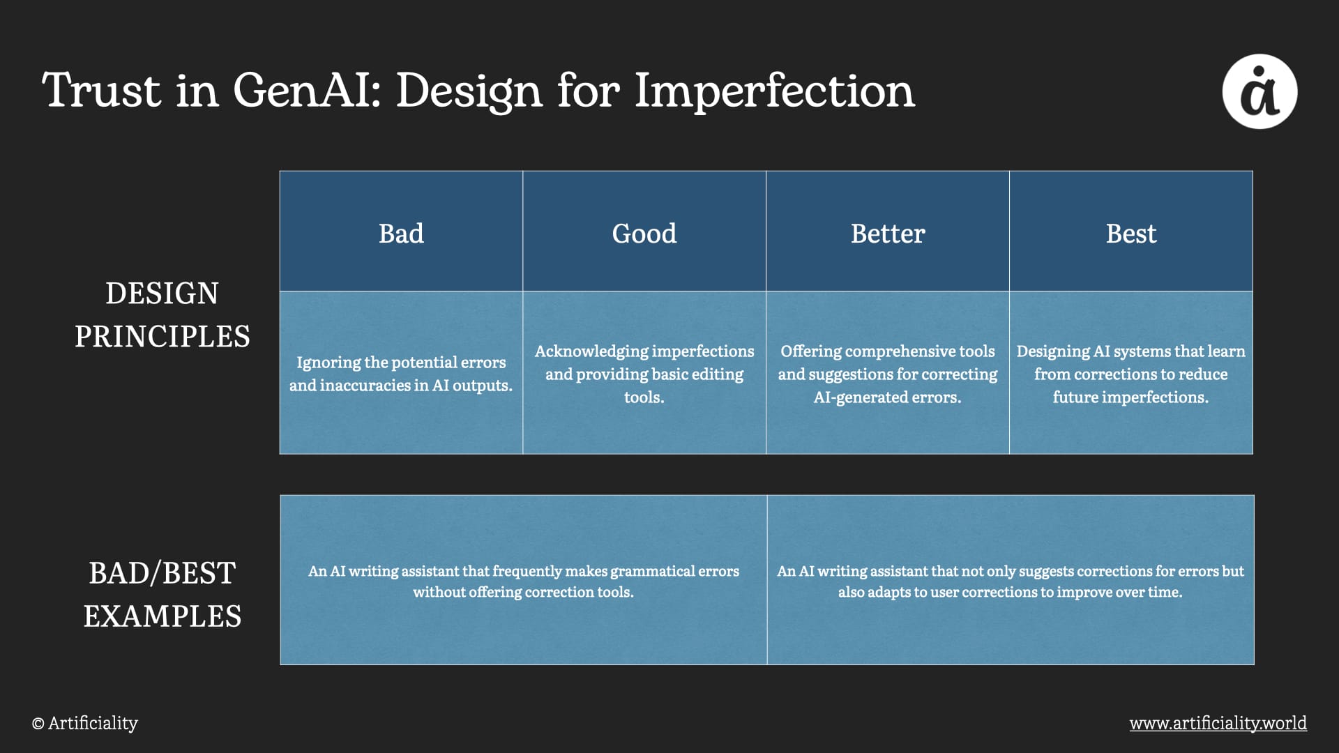 Design for Imperfection recognizes that GenAI outputs will not always meet users' expectations or needs. This principle advocates for designing systems that not only acknowledge the imperfection of AI-generated content but also equip users with the tools to easily refine or iterate upon these outputs. Providing clear feedback channels and editing tools can empower users to improve upon the AI's creations, ensuring they remain valuable and usable.