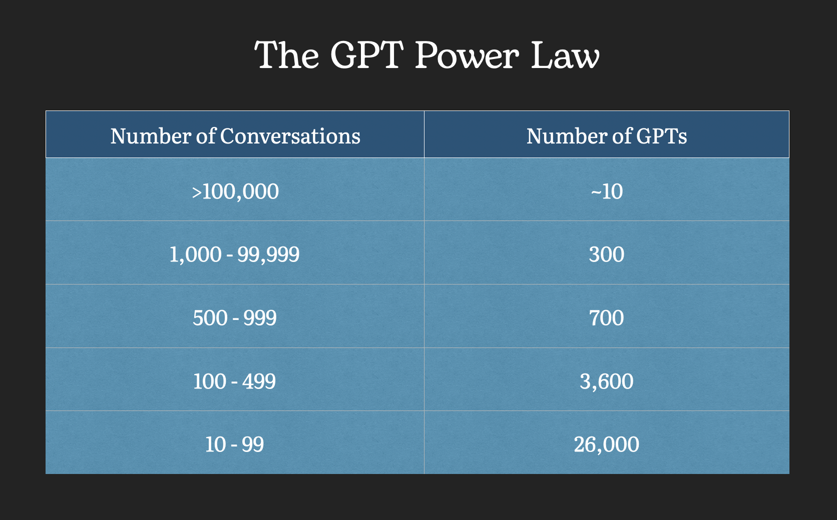 While it's true that not all GPTs are created equal, it's even more crucial to understand that the connections between GPTs and users vary significantly. Data from conversation analysis reveals that only a few GPTs dominate in terms of usage.