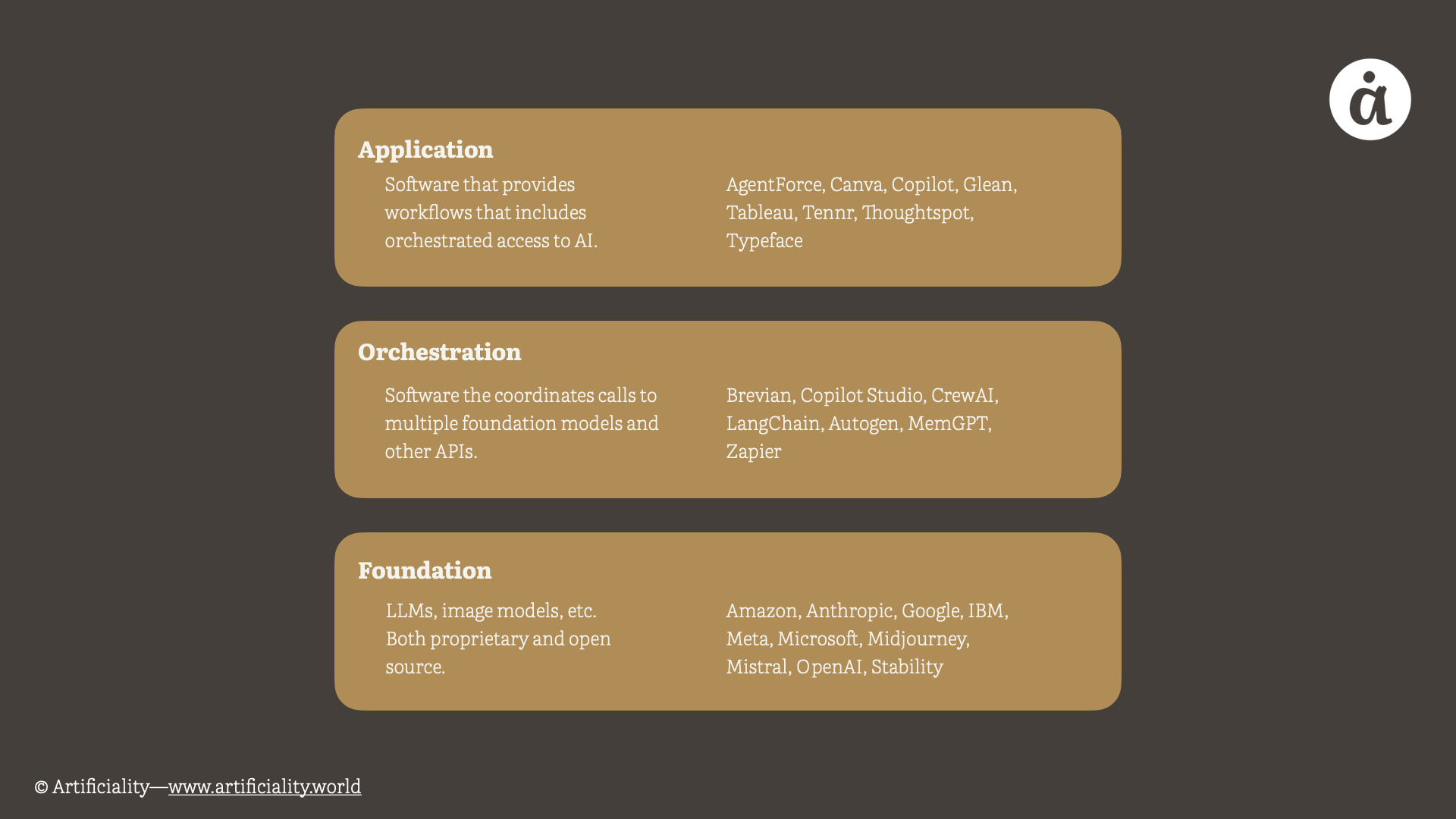 We like to map out the shifts in AI in a way that’s clear and practical. The landscape is complex, and no framework captures everything, but we’ve found it helpful to think about AI software in terms of layers. This is a simplified view—real-world boundaries are fuzzy—but we think it’s a useful lens for understanding where things are today and where they could be headed within a timeline you can plan around.