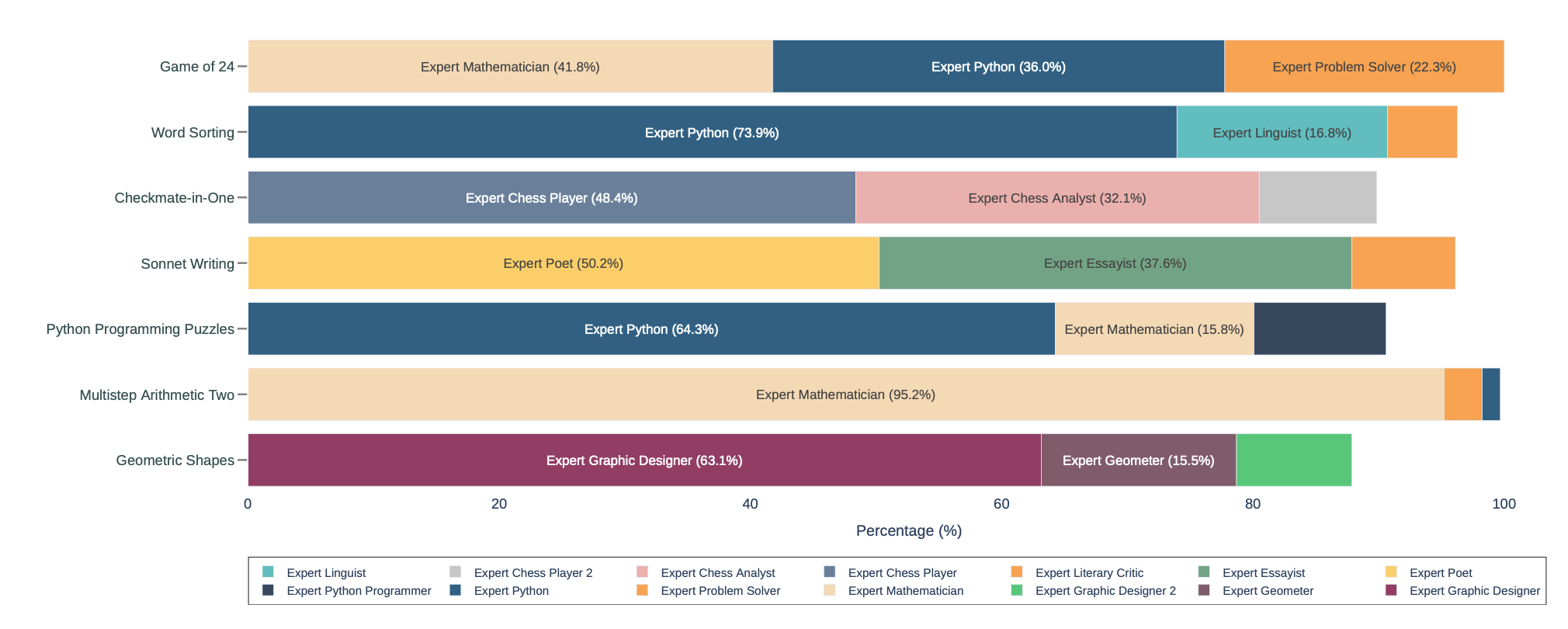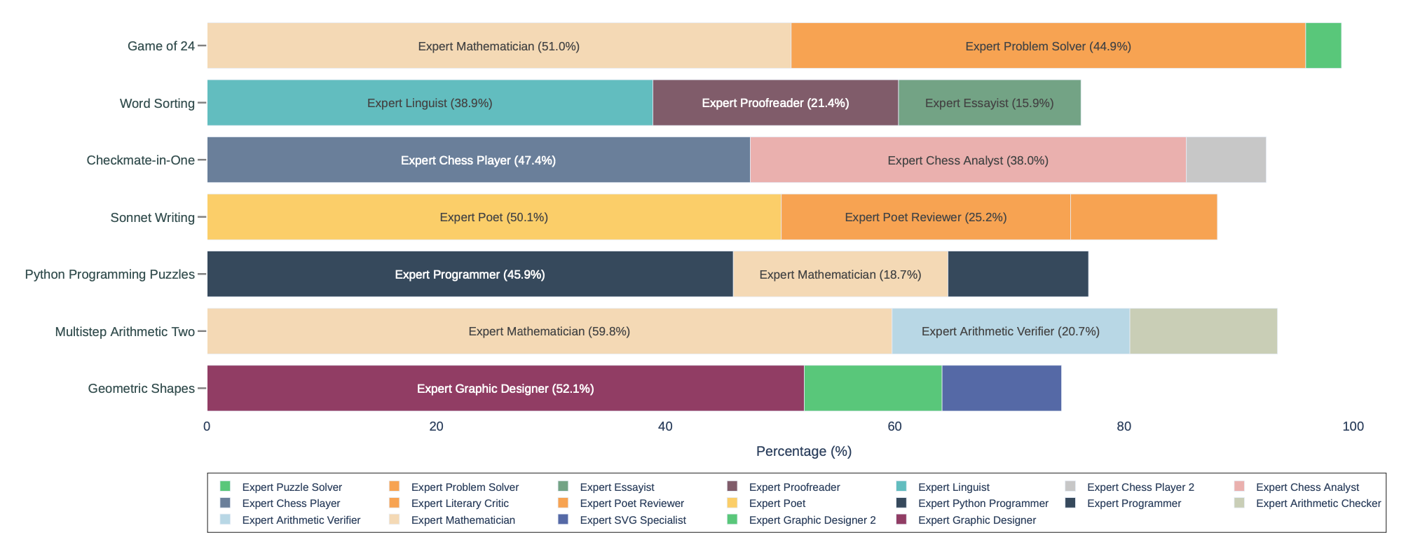 The paper includes visualization of the distribution of experts conjured by the meta-model—with and without code. The charts offer glimpses into the two modes of reasoning unlocked by the meta-prompting and with and without using code. Generating code in real-time as part of a meta-prompt gives off system 2 vibes.