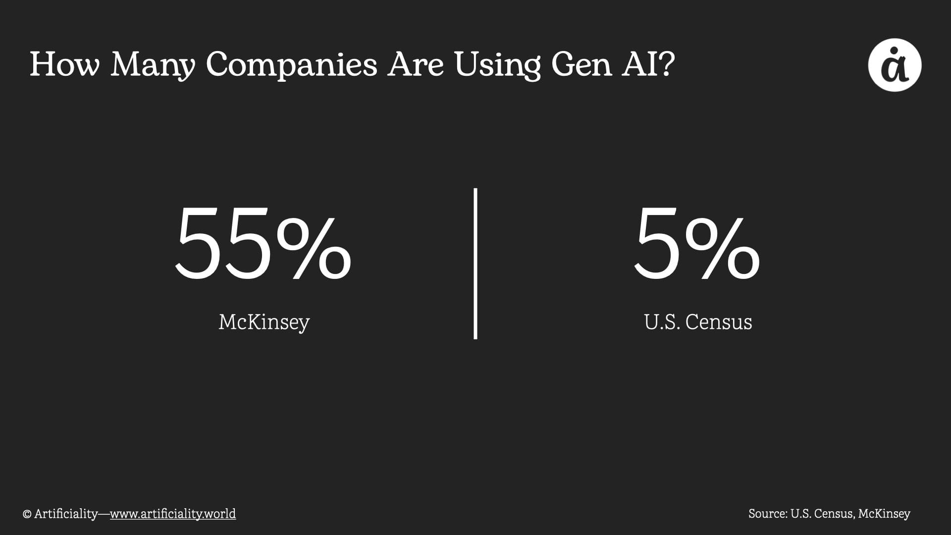 You want to find out how many companies are using Gen AI, you can get wildly different results. Here's two different answers. 55% of companies are using general AI. According to McKinsey, and only 5% are are using general AI according to the US Census, the US Census has started doing a new survey to assess the impact of AI on the economy, something that I think they're doing twice a year, or they're expecting you twice a year. And we are very interested in looking at how they're assessing it. Because they take such a broad view of the overall US economy. There's a wide delta between 55 and five. And every time you see something different like this, you wonder Gee is did they asked the question differently, they find a define AI differently, etcetera, are a set our guest is that the real delta here is that the US Census is looking across every company and getting responses back across the economy. Where's McKinsey is reaching out to companies that they work with. And they're probably getting responses back from companies they work with. So they're looking at very the largest companies and that slice. It doesn't make either of these answers invalid. But it does make make it important to understand when people say everybody's using it, but then you walk around and think that that not everybody's really using it both of those answers can be true, just depending on which part of the population are actually selecting.