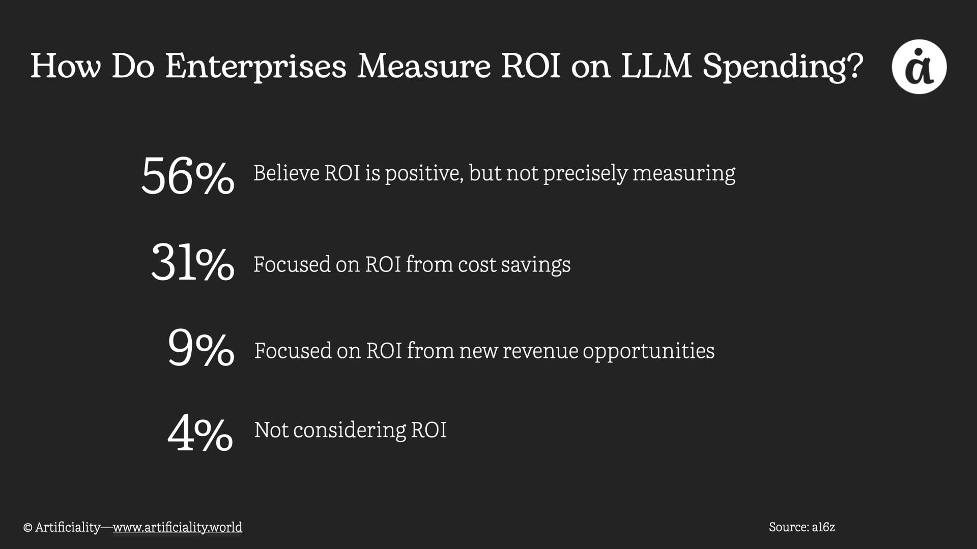 One of the questions that comes up a lot is how to how are people measuring ROI? So if you're not seeing the ROI and copilot, well, then how are you actually trying to measure it? What is that measurement? Often we've written about this in the last couple of few weeks? This comes from a survey from a16z. So the venture firm Andreessen Horowitz, so put the caveat there that this is organizations that a16z wants to talk to, and organizations that want to talk to a tech VC. But it's interesting that more than half when they when they're asked about how they're measuring ROI, on LLM, spend, half of them believe it's positive, but they're not precisely measuring it. Right. So they're the companies that are pursuing spending money on LLMs. More than half of them, according to this survey, at least, are saying, Yeah, we just believe it's going to work. And it's going to be worth it. We're not measuring. So when you put that combined together with the with the with the sort of question of gee, we're not seeing the results. So there's definitely organizations falling in the bucket that say, we're not seeing it. So we're not spending, but the ones we're spending more than half of them just aren't even measuring. Neither one of those bad thing by the way, this is just sort of getting at some of the common trust.