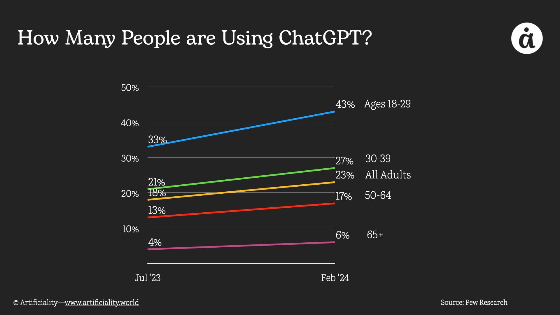 And you're looking at how many people are using chat GPT. This is data from Pew Research that spans six months between July 23, and February 24, a significant growth of people using chat GPT, across all age brackets, that yellow line in the middle is all adults that increased from 18 to 23%, then you can see all the rest of the lines, the youngest is at the top down to the oldest. So seeing a disproportionate usage of chat GPT and younger workers aged 18 to 29, versus those who are older, but every category is increasing. And by a pretty significant number across all age brackets.