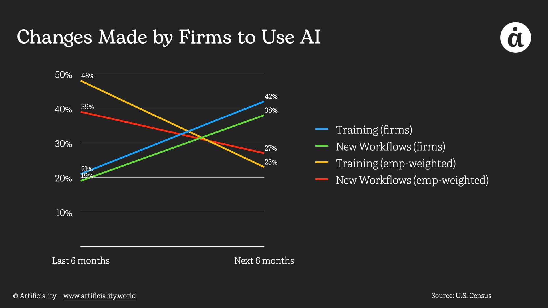 Size of companies interesting. So we looked at companies that are talking about trends meaning people to use AI and creating new workflows for people to use AI. And what we've done here is isolated the data based on whether it's counting the number of firms, or it's creating an employee waited an answer. So look at the number of companies versus the size of the company essentially, is kind of where these numbers come out. The blue and green is showing total number of companies. So roughly 20%, to roughly 40% of companies are expecting to go from training and new workflows from the last six months to they're expecting to increase the number of amount of training and creating new workflows. But then if you look at the employee weighted numbers, it's a significant decline from 40 50%, down to sort of roughly 25%. What this says to us is in the data is we're seeing a lot work, there's a lot more expectation of growth in creating training programs, and creating new workflows for smaller companies, which is why that number of companies sort of data as is exploding.