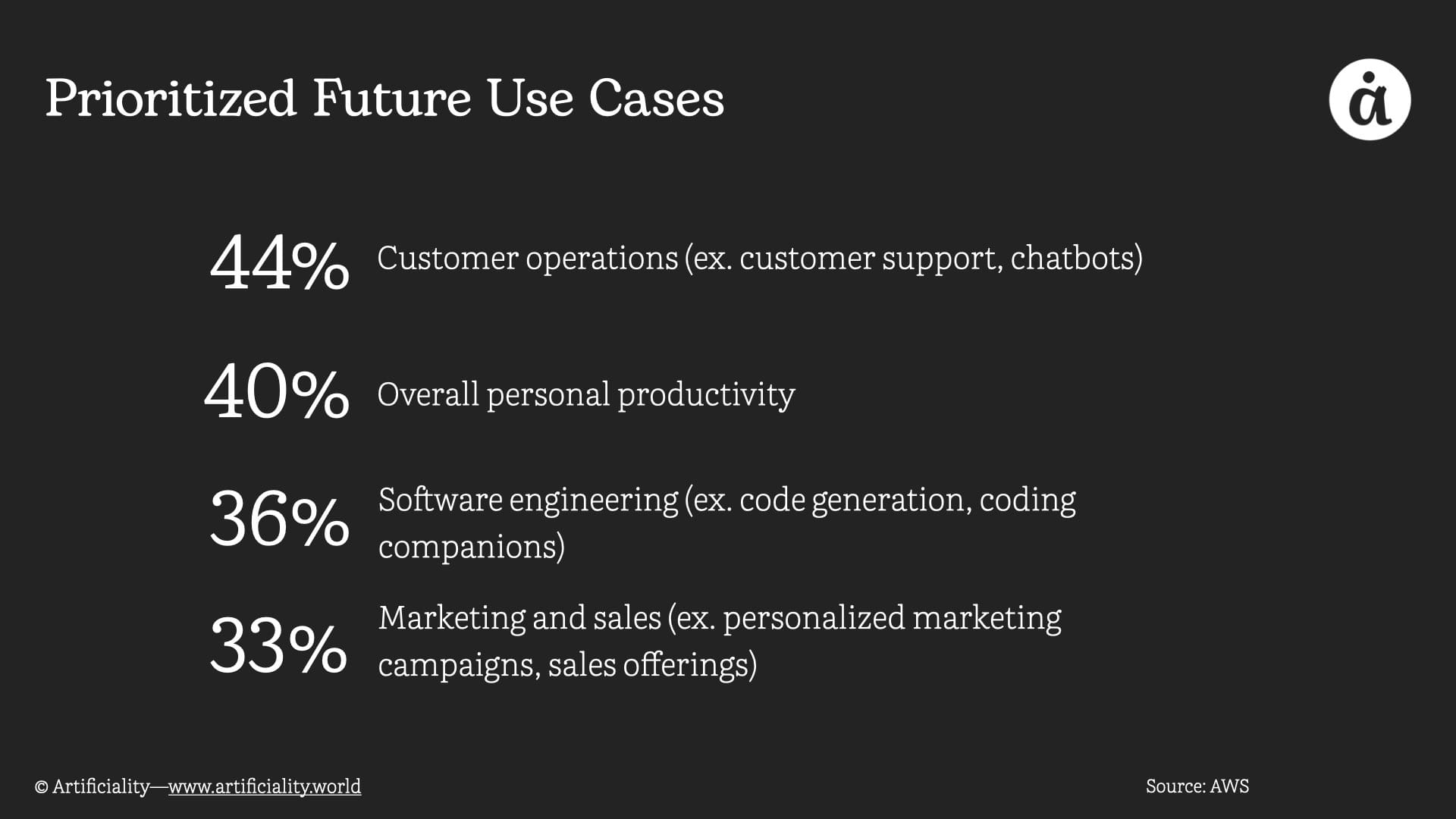 For this survey, those same group of CTOs prioritize our future use cases, customer operations, Support Chat, bots, overall productivity, personal productivity, software engineering, and marketing and sales. Those are the big categories that that echoes what we see when we're dealing with our clients and talk to them where they see the opportunity where they prioritize what they'd like to go pursue. These all fit fit in the same zone.