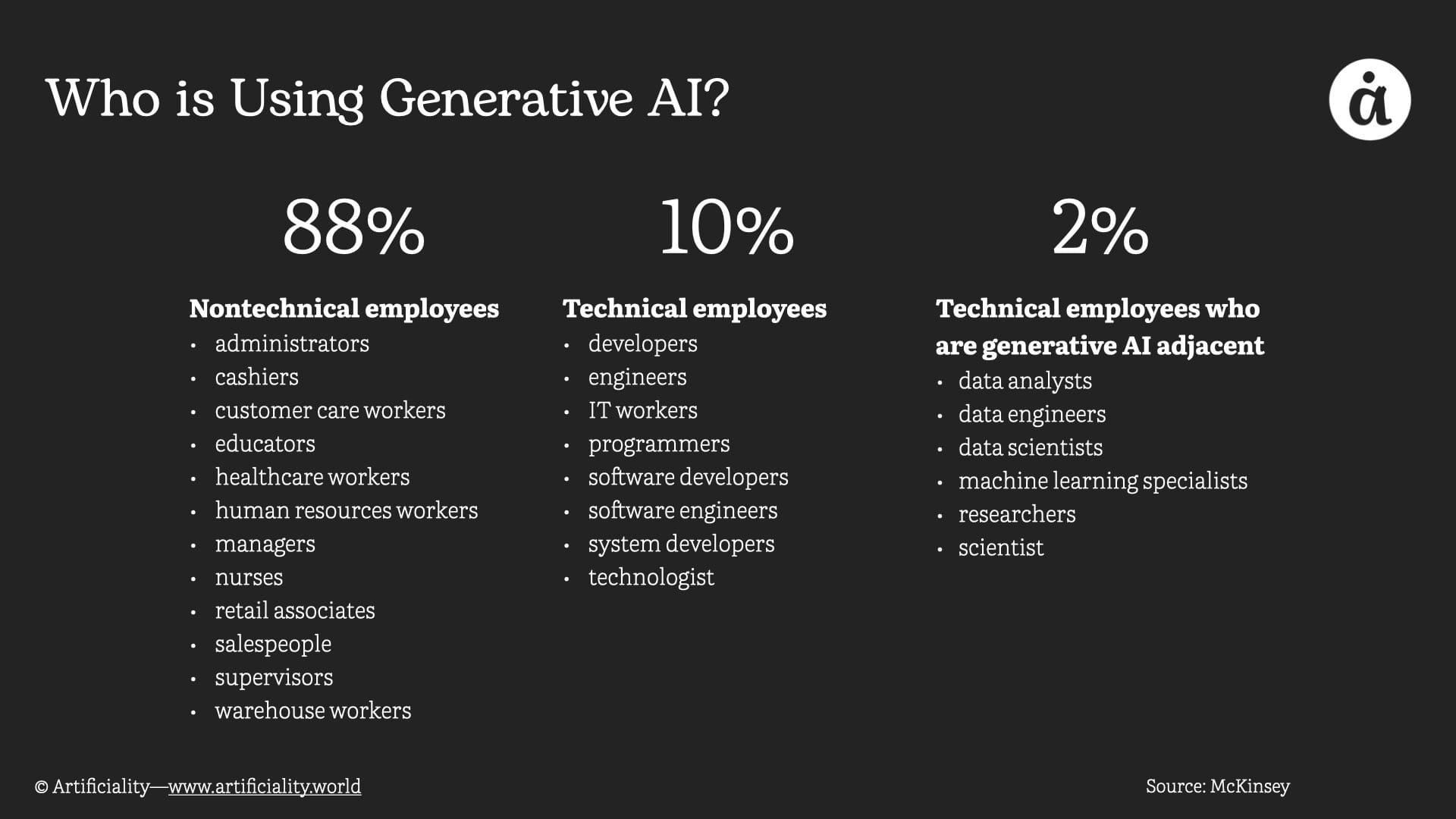 Last data on who's using generative AI And this is from McKinsey. So again, in that large scale company kind of survey, but still quite useful and helpful, is 88% say that the non technical employees are using generative AI that says that this has moved outside of the IT group, which is 12%. Total, we separated this out 10% of technical employees, and 2% of technical voice or eight or generative AI Jason, just helpful to understand that that they see it as a very small number of people who are adjacent a generative AI versus the total population are using generative, and that's helpful. But it says that this experimentation that's going on is happening outside of the IT group. So this isn't isolated to having programmers and developers and data scientists and analysts trying these things out. They're trialing and they're driving out the usage and the rest of the organization.