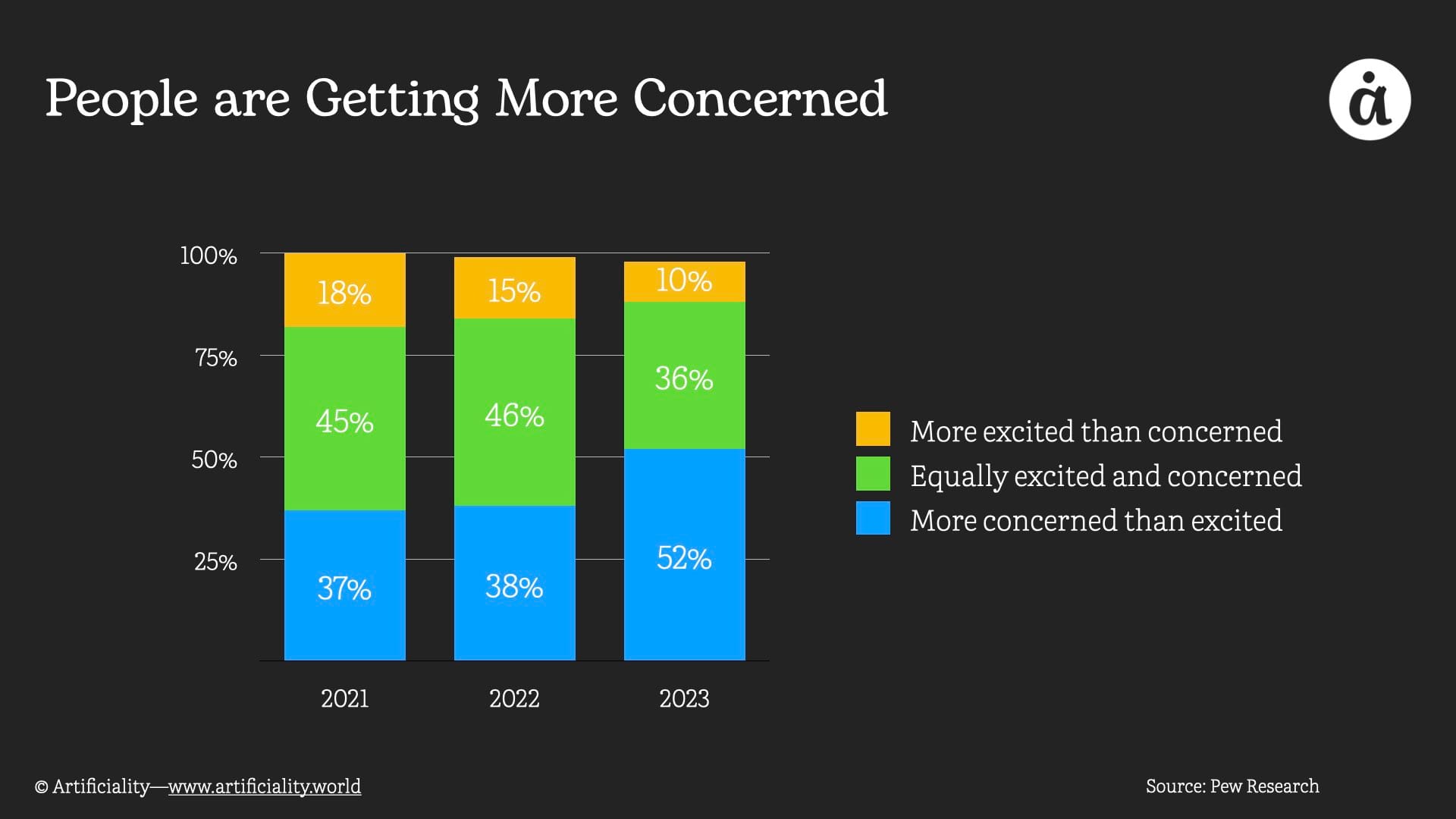 Okay, so let's talk a bit, we've got some sort of broader society questions to talk about and data that looks at anxiety around AI. So you're not you're not imagining it, survey says that people are getting more concerned. So this is more data from Pew Research. Bottom blue bars are what to look at there, those of those who are more concerned than excited, and wasn't much changed from 21, to 22. But in 2023, a pretty significant jump from 38% to 52% of people are more concerned than excited. And there's a big drop of more excited than concerned from 15% to 10%. So as ChatGPT really started to move across the, you know, across the society as all of the other general AI tools too. But that's where people are much more concerned than the excited are about AI.