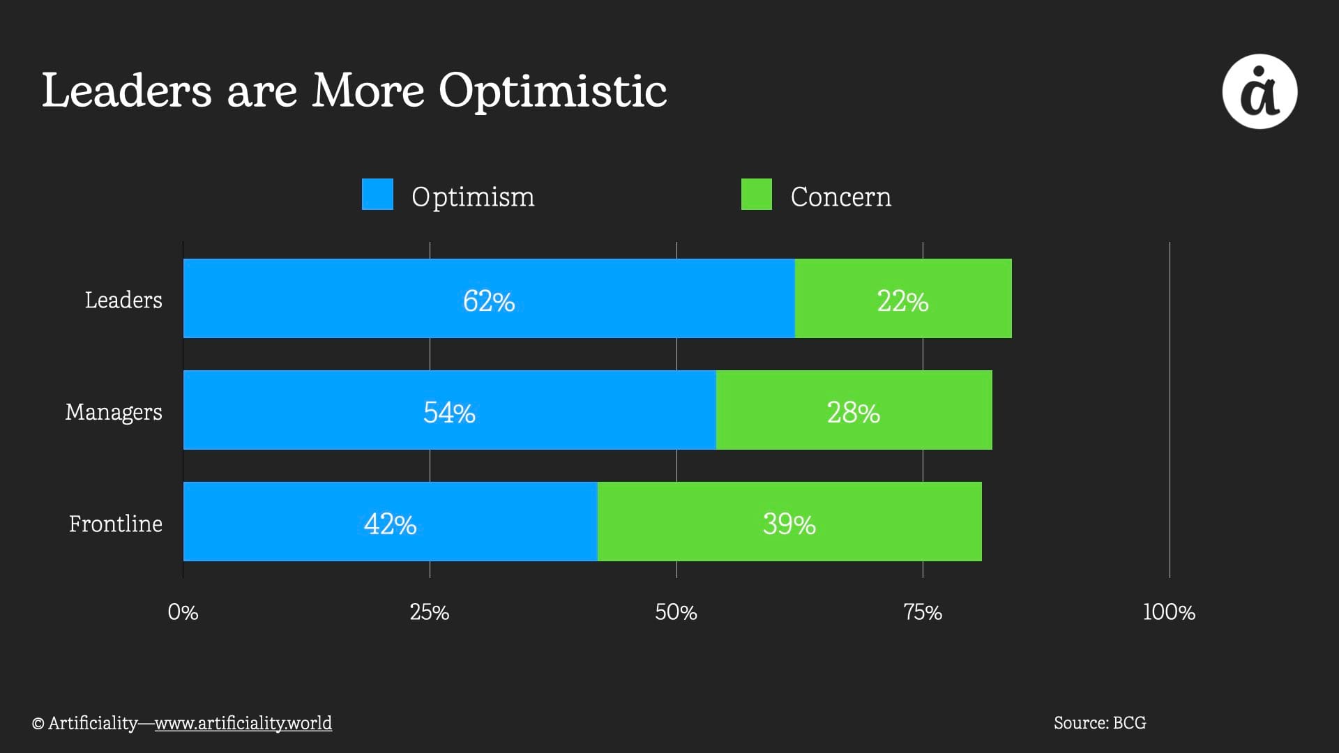 Now, there's differences about who's more excited and not. So let's look through some of the some of that data. So leaders are more optimistic than the rest of their organizations. This is something that we find to be a very common pattern across organizations that we work with, is a stable stable from the beginning a decade. And we've seen it from across companies, we see it across higher education institutions. This is from survey data from BCG. So leaders are 62% optimistic 22% concern and there's clearly a, you know, a not an NA or don't, or neither kind of response to that would add up to 100. Managers 54%. Optimistic, frontline 42%. So leaders really excited, they're optimistic, they're less concerned frontline. It's about 5050. In terms of optimistic and concern. This is particularly a problem in our minds. Because we we believe we also see that the best ideas come from those on the front line. So the people who are coming up with the best use cases are the ones who are actually using the tools day to day. But they're also the ones who are using the tools day to day. And they're getting more concerned about what the effect might be on these tools,