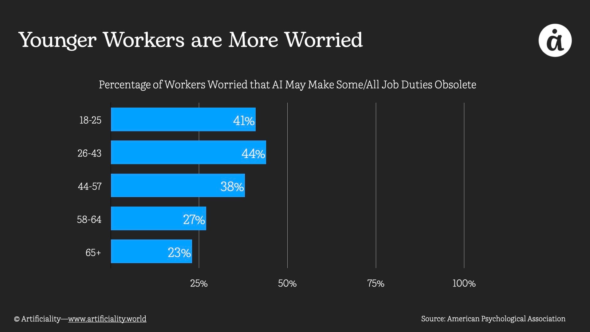 So there's couple other ways of slicing this demographic. There's a handful of slides here from the American Psychological Association, which is quite interesting. So you look at the workers, the percentage of workers who are worried that AI may make some or all job duties obsolete. And this is by age bracket. So you can see obviously, the ones who are the most concerned, most worried are the 18 to 25 and 26 to 43%. And then it declines in as the older groups. Now, that could be because those who are 26 years old, have more years ahead of them to be worried about displacement, whereas those who are above 65 or fewer, it could be that those people or those younger age brackets are also using the tools a lot more we saw that in earlier data. So you see the power of a so you see the power of it. So you actually like feel the effect and you're more worried. We don't really know why but interesting because this is a good way of thinking about across your organization teams like who's who when you walk into a room, how can you expect Who do you think is probably most likely to be using but also who's most likely to be worried, and why?