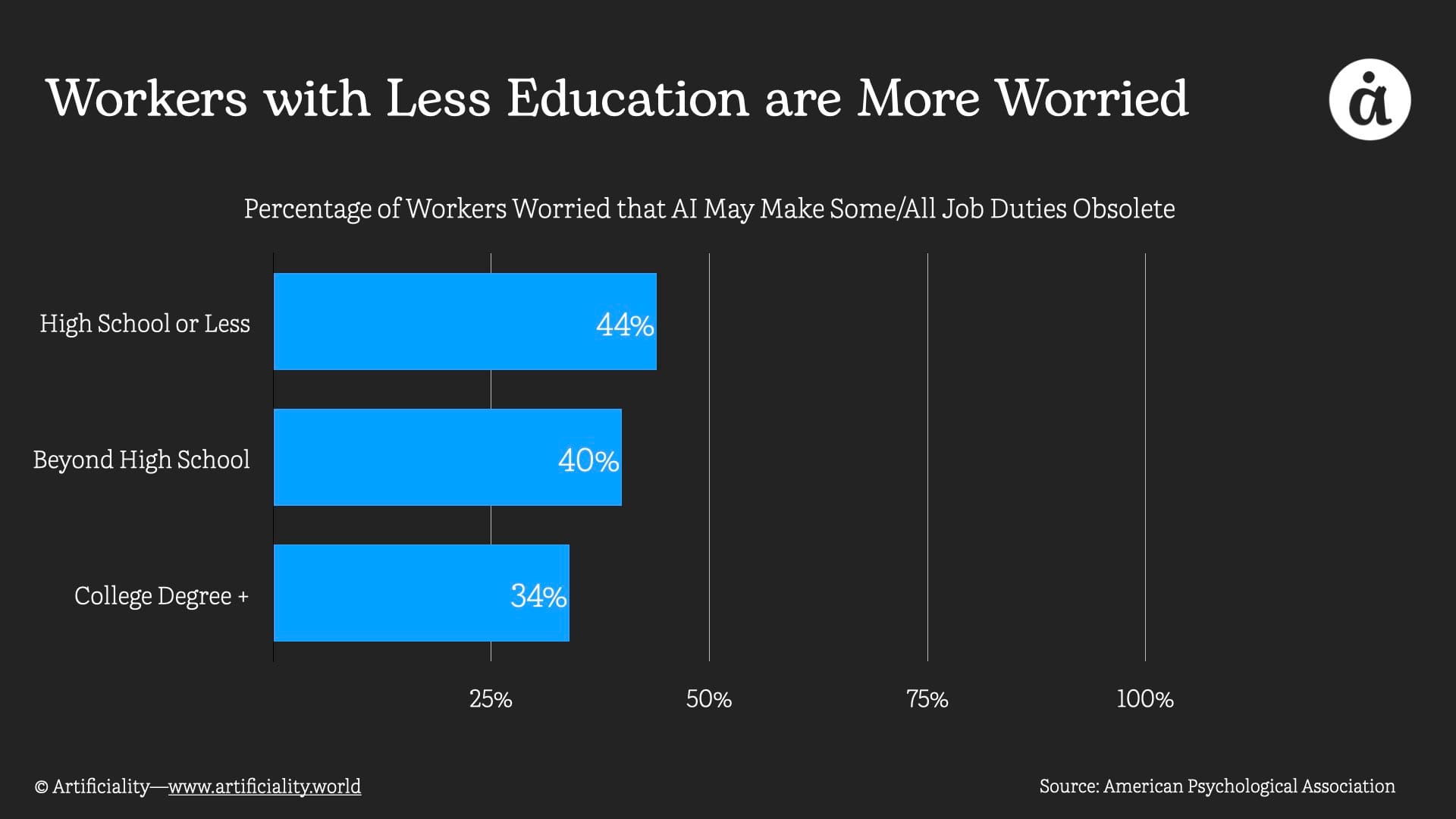Those who have less education are also more worried. So those who have a high school degree or less 44% of those are are worried that AI will make some or all of their job duties obsolete. Those who have a college degree or beyond, only 34% of those are worried.