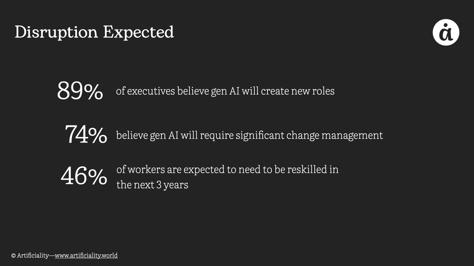 This is data from BCG around the expectations 89% of executives believe Gen AI will create new roles 74% believe Gen AI will require significant change management 40% 6% of workers are expected to need to be rescaled in the next three years. No wonder people are anxious. It's a colossal right that's a huge change. that leaders are out there talking about and professing. And if you take a moment, or it's about 15 minutes to watch the Jon Stewart thing from The Daily Show about AI this week, you'll notice the quotes at the end that he has, from the great, you know, the big tech leaders who are all saying that you know, who will eventually admit that generative AI is a labor replacement technology, this shows some of that, that expectation is that this will be quite a lot of disruption. And that's quite a lot of challenge and problem.