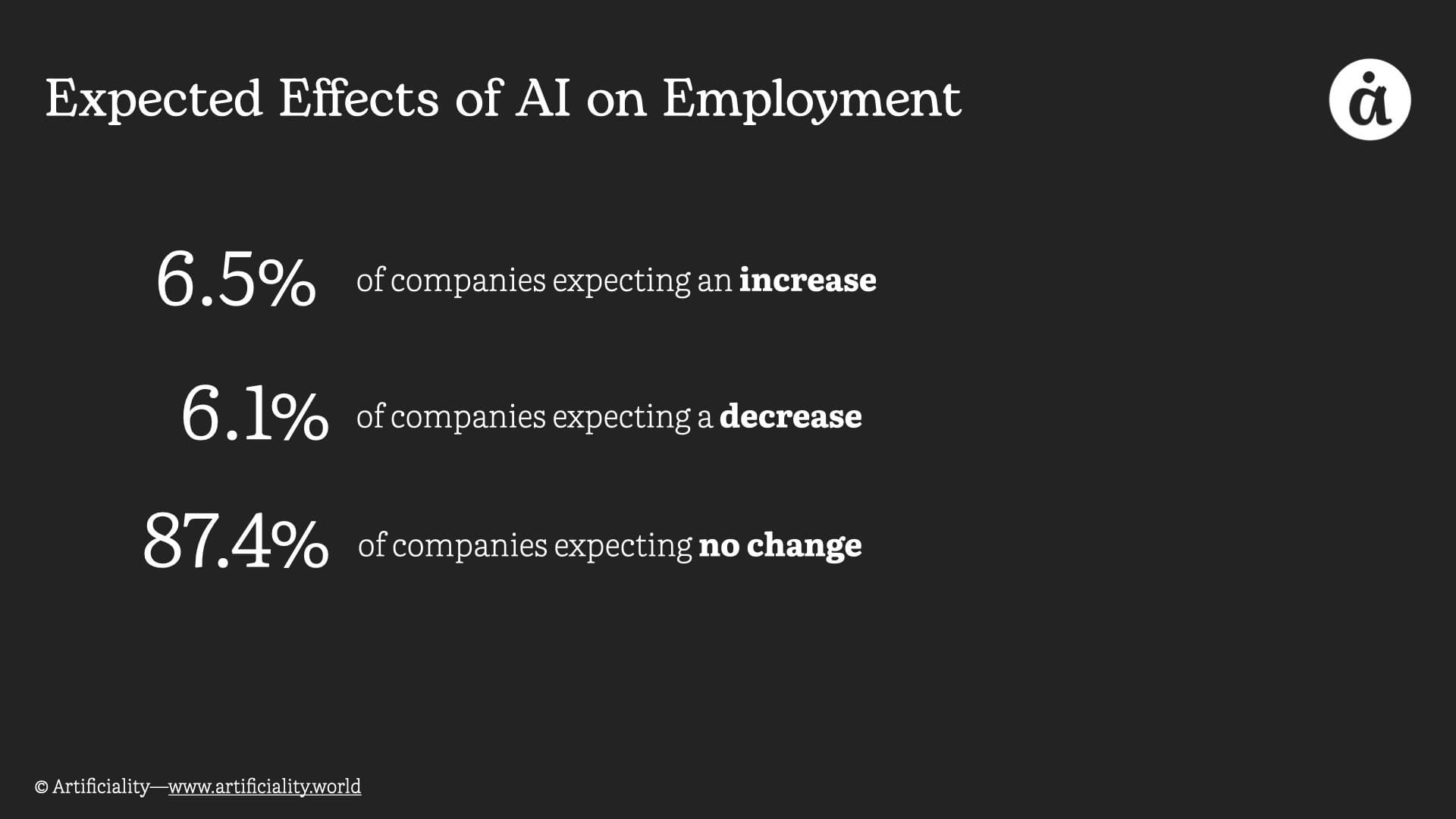 Interestingly, when you get to this level, this is again, BCG. The vast majority of of leaders that they that they surveyed say that they're not expecting any change to employment. So that's an 87% at the bottom. And it's split 6% Either way of companies expecting an increase of employment and a decrease of employment. Not really sure what to think about all that. But it's interesting just to see, that's where that people are thinking, huge change, new roles, some ups, some downs, a lot, no change, we'll see how this maps out, I think that these numbers will likely be more dynamic over the next year or two.
