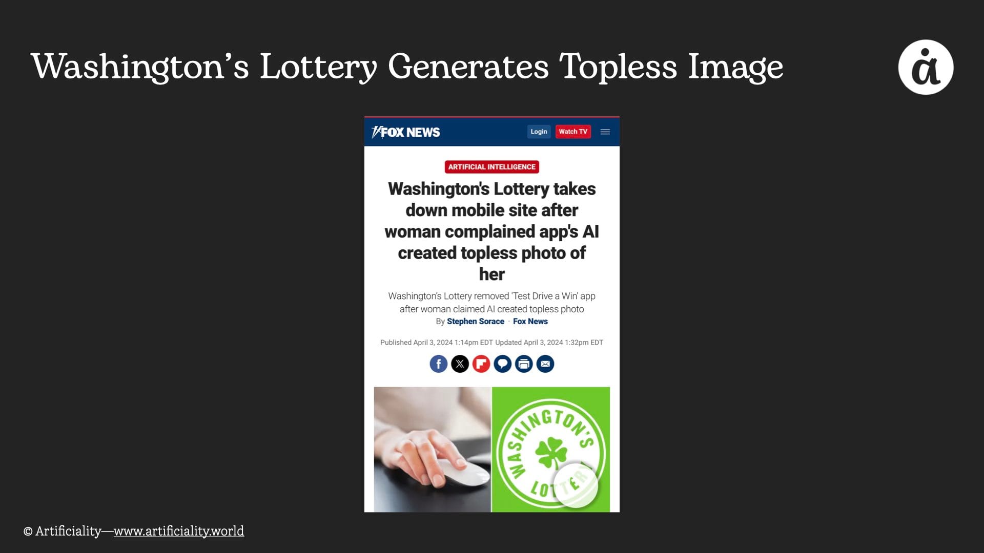 Second one, the Washington State Lottery created an app called Test Drive a win where you could say, This is my dream, if I win the lottery and woman was said that her dream was to be able to go swim with sharks and the app asked her to upload a photo of herself. And it created a photo that was like, Hey, this is you after winning the lottery, and it was her on the beach and her face on top of a topless body. So clearly a problem that should have been something that guard rails could prevent, but clearly it didn't. That was a problem.