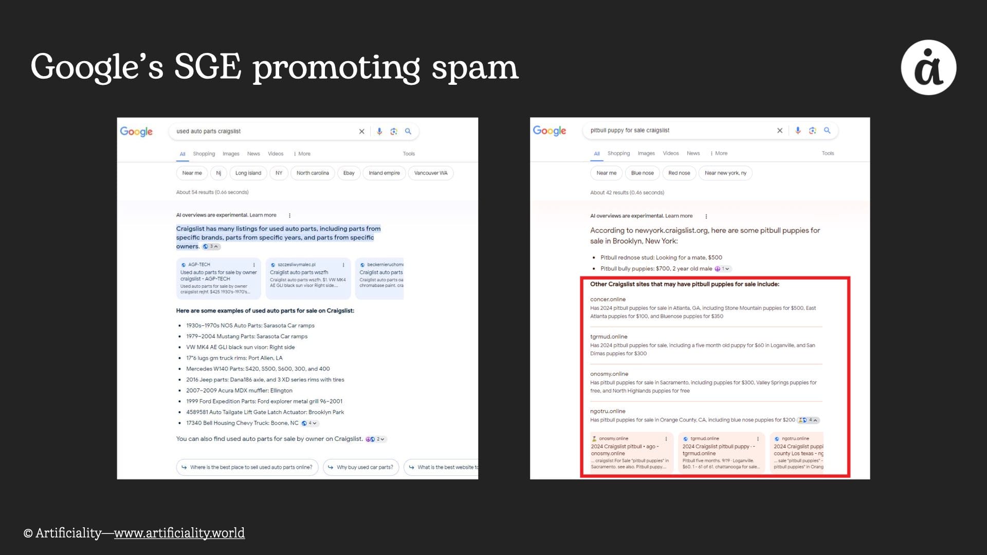 And then last one is one of the big tech. So Google, their search generative experience, which is something you can access to search, through Google Labs, is has been shown to be propagating a bunch of spam results. So when you're searching for in the left, used auto parts on Craigslist or Pitbull Puppy for sale on Craigslist, spammers have figured out how to get insert their, their links into something that people can actually that will generate as a result in the generative search experience. And you can see when you look at the URLs here, these are clearly spam results. But they're coming through as as results through SGX. Anyway, thank you so much for joining us. And we've just gone a little over time. We will continue we'll be doing this again next month. I can't remember exact date, I think it's the week of May 12. And next topic will be a agentic AI so less data and more talking about what's actually going on when we're thinking about developing agents, which are basically it was a way to use AI to go do a multi step process. So that'll be our deep dive theory right now. Cool, and let us know what you thought. We'd love to hear from you. You know how to get in touch with us. Please do and thanks for being with us.